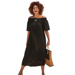 Nonchalant elegance is what this off-the-shoulder dress is all about. Styled with a smocked bandeau neckline, its relaxed maxi length silhouette loosely drapes the body. Notice the side pockets you can casually slip your hands into as you saunter along the beach or boardwalk.