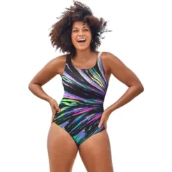 Looking for a swim style offering style and support? No prob. We have your back. This one piece has cool cross-back straps along with splashy patterns to give it plenty of style. It offers full bottom coverage and a tummy smoothing Power Mesh lining. Plus, it’s chlorine resistant to help guard against fading.