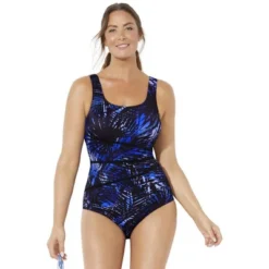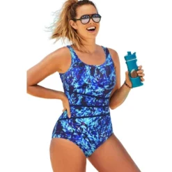 Make your move in this sporty one piece swimsuit designed with no-fade fabric that stays brighter, longer. Splice detail at the waist creates a flattering silhouette and Power Mesh lining provides smoothing tummy control so you’ll look your best and feel totally confident at the beach, pool or anywhere you sun.