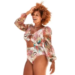 If we had one word to describe this suit it would be: Wow! This one-piece beauty has long chiffon sleeves for added coverage and chicness, a tie neckline, cut-out detail and tummy smoothing Power Mesh lining. Choose your cup size like you would your favorite bra for incredible bust support and your best fit.