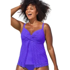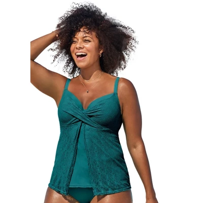 You’ll love the flowy, sun-goddess vibe of our faux flyaway tankini! Noted for its beautiful crochet detail, Fun twist-front sweetheart neckline, supportive features like a built-in underwire bra, and adjustable straps to adapt the shape perfectly for your body. Pair it with your favorite swim bottoms for your own unique look.