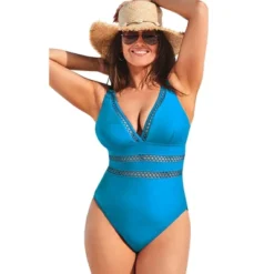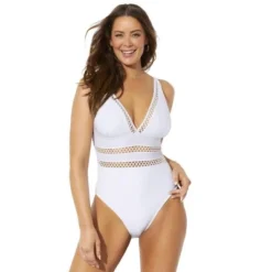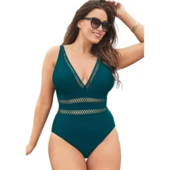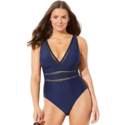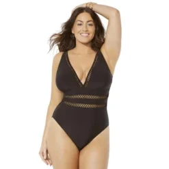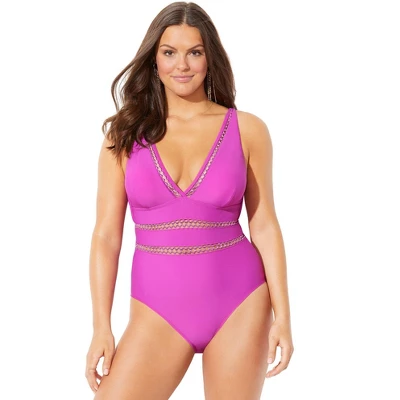 With a plunging V-neckline, soft, wire-free removable bra cups, and tummy smoothing Power Mesh lining, this Lattice Plunge One Piece Swimsuit shapes and flatters like no other. It’s accented with lattice trim and has adjustable straps, so you customize your fit. Like all Swimsuits for All swimwear, this style is designed by the swim experts for an unparalleled fit.