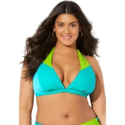 Fall in love with this vibrant, chic bikini top that checks of all the boxes. The color blocking gives it a pop of playful style and helps slim and shape your silhouette to flattering proportions. The self-tie halter and back straps let you adjust the fit until it’s perfect for you. Wear with the Romancer Color Block Bikini Bottom or mix and match with the swim bottom of your choice.