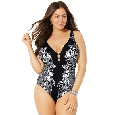 Dazzling details make this one piece a standout style! With a plunging V-neckline with gold ring detail, placement print and Power Mesh tummy-control front lining, this suit is designed to flatter every figure. Like all Swimsuits For All styles, this one piece is expertly crafted with quality fabrics and meticulous construction so you feel as good as you look.